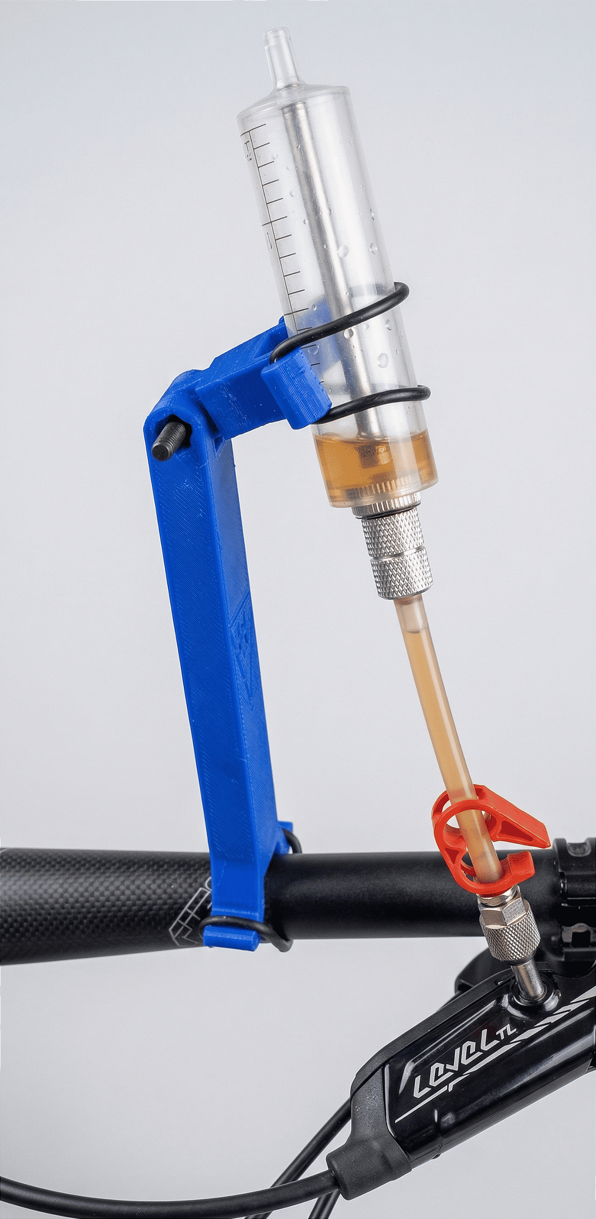 O caos de equilibrar seringas, quadros e óleos. Quem já fez a sangria (bleed) de um freio hidráulico sozinho sabe a bagunça que pode ser. Você precisa bombear o manete, fechar parafusos e, ao mesmo tempo, garantir que a seringa não caia e derrube óleo corrosivo no quadro ou no chão. Equilibrar tudo isso com apenas duas mãos é estressante e aumenta as chances de erro.